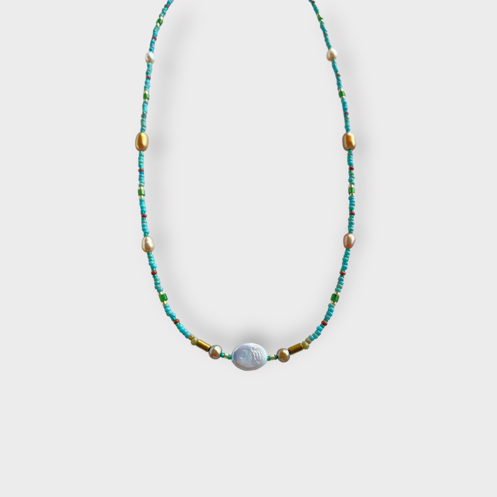 -Oval freshwater pearls as pendant with freshwater pearls throughout and glass Picasso beads
