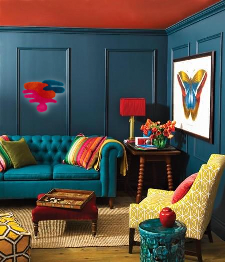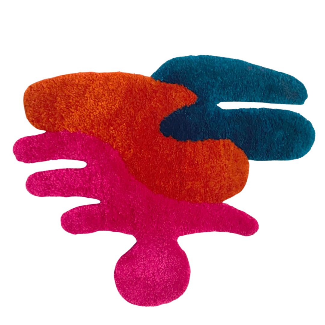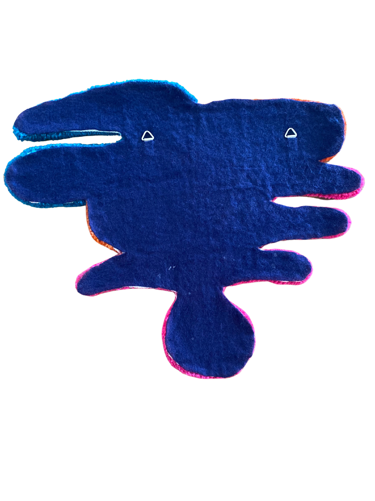 Tufted wall piece with navy blue, felt backing and two d-rings for hanging. Made with acrylic yarn. Spot clean only.