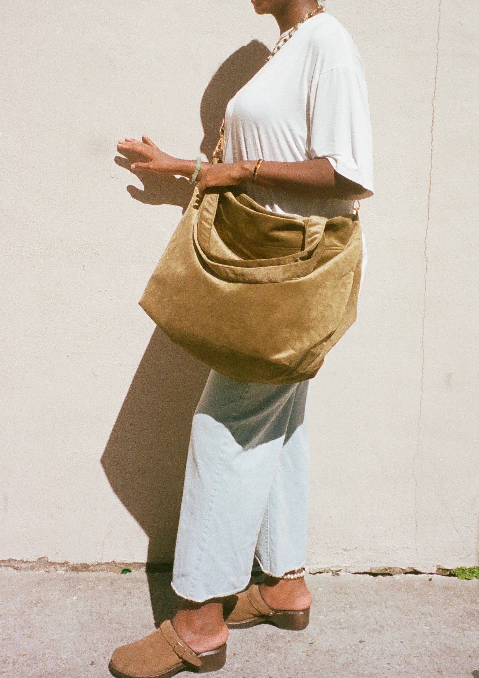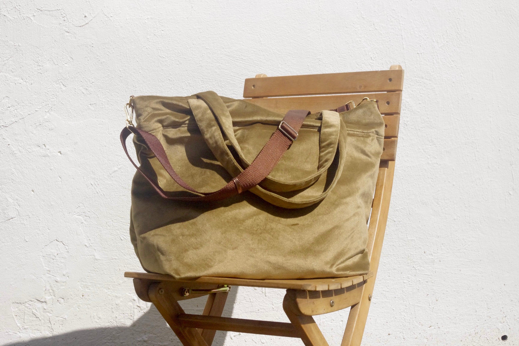 Outer is velveteen while the inner is satin. Features inner pocket, two top handles, one adjustable crossbody strap in mocha color. Gold clips on end of crossbody straps allow for the strap to be removed. Metallic brown leather secure the hardware and straps in place. Taylor Lauren label over inner pocket.