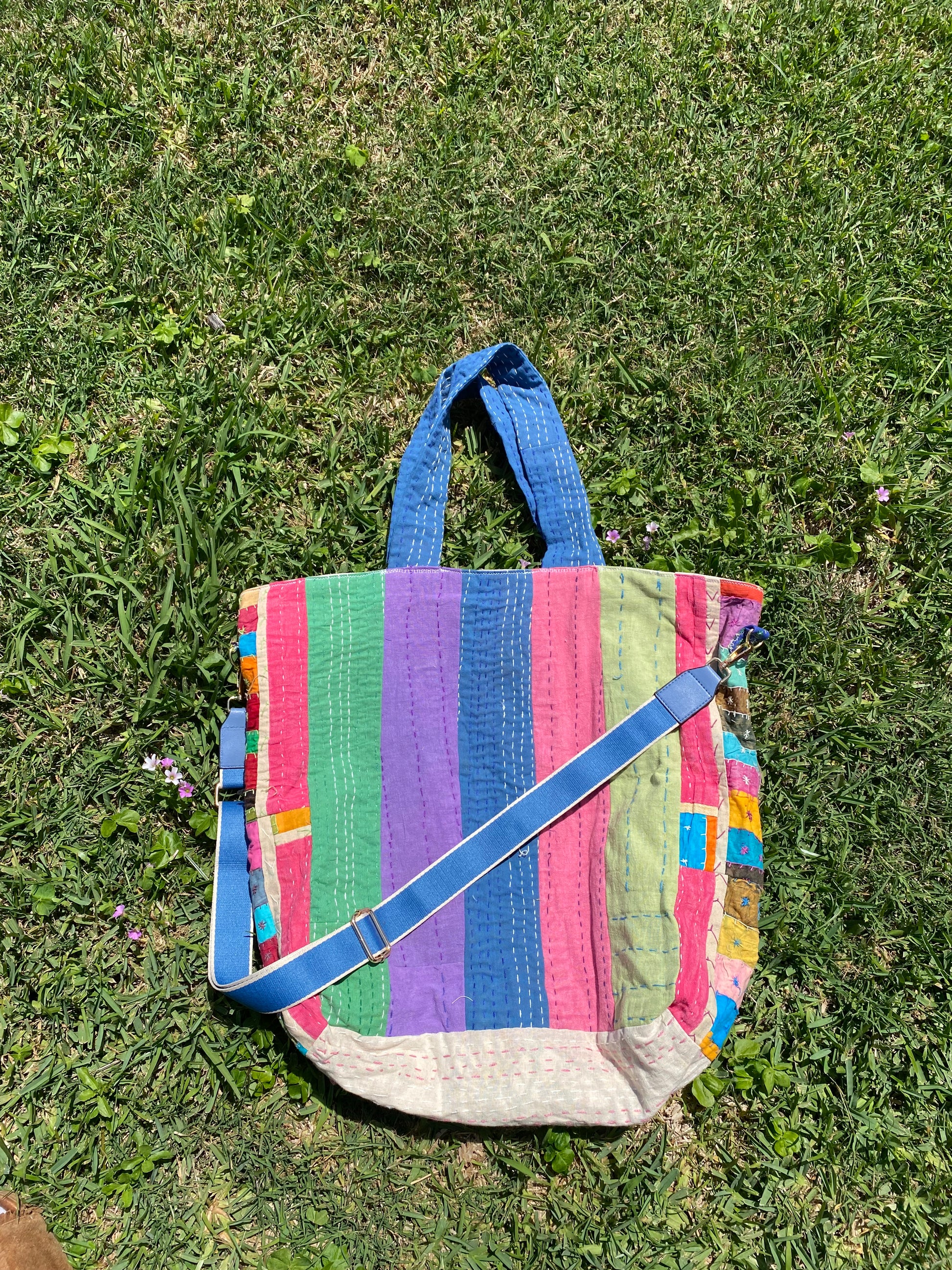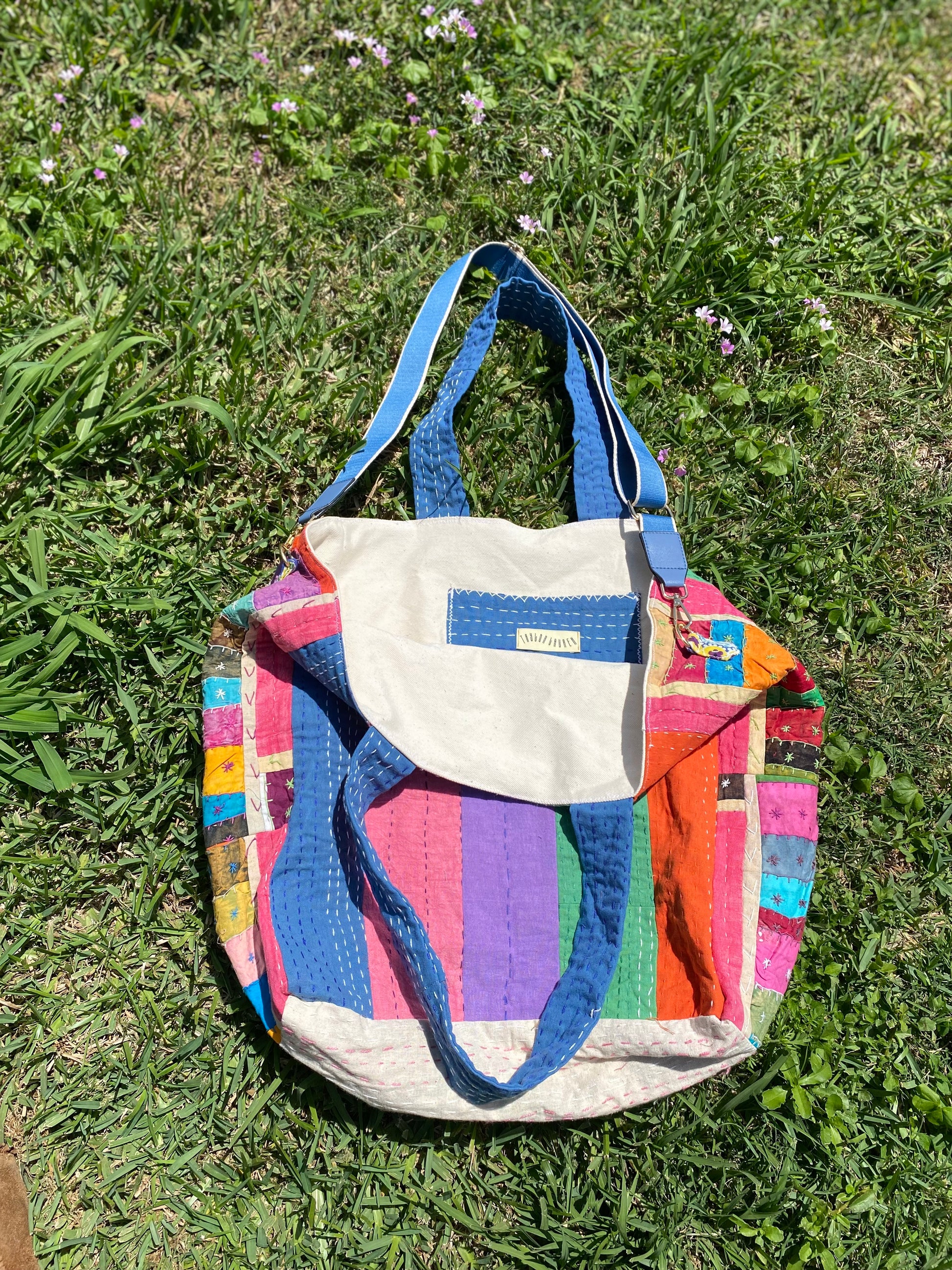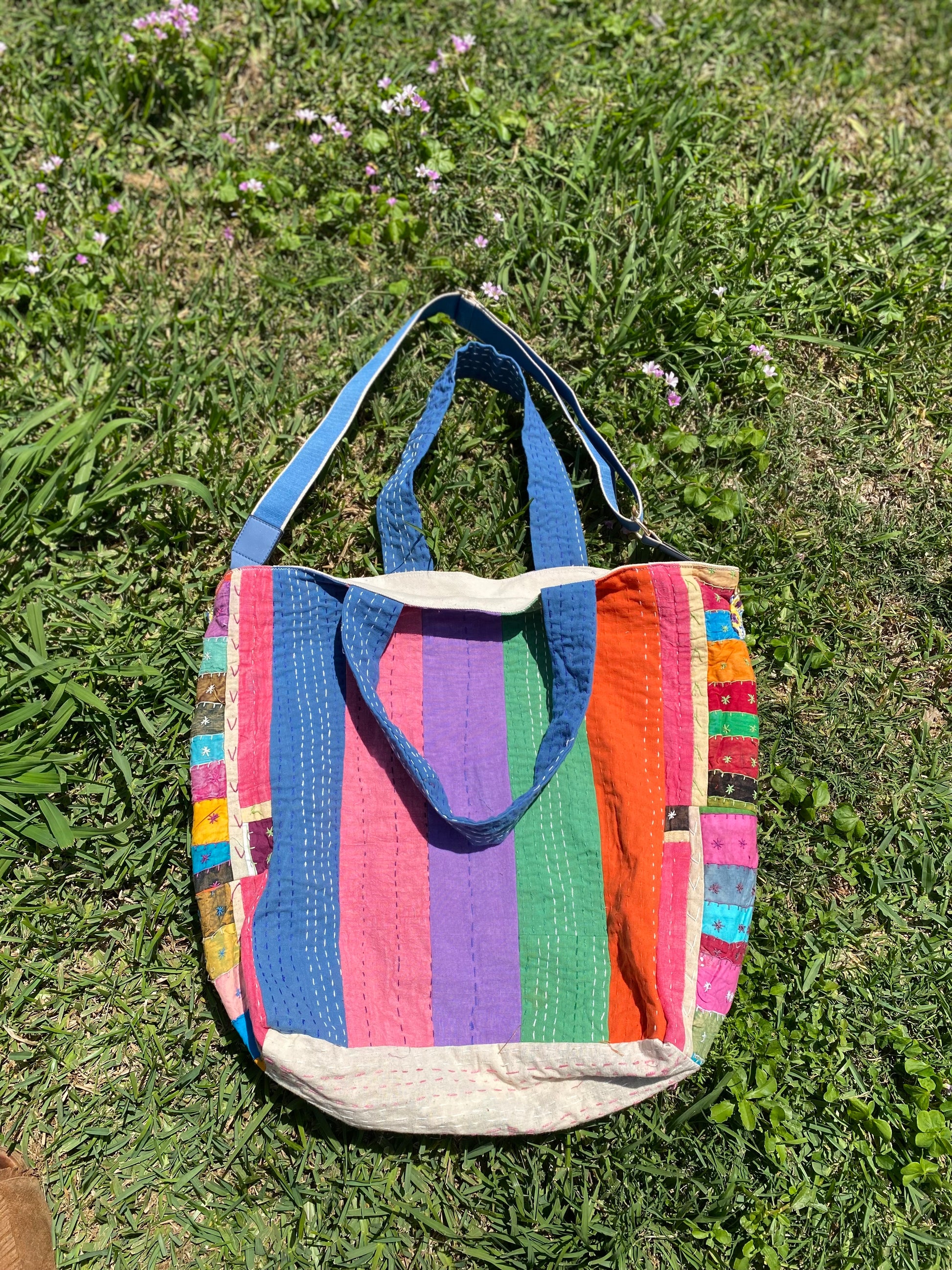 Carefully collaged kantha quilt tote with canvas lining and inner pocket. Two top handles and adjustable crossbody strap.