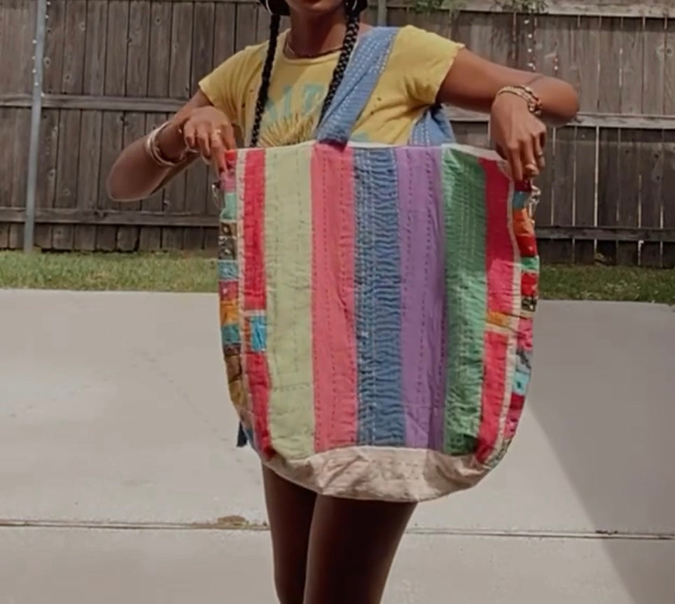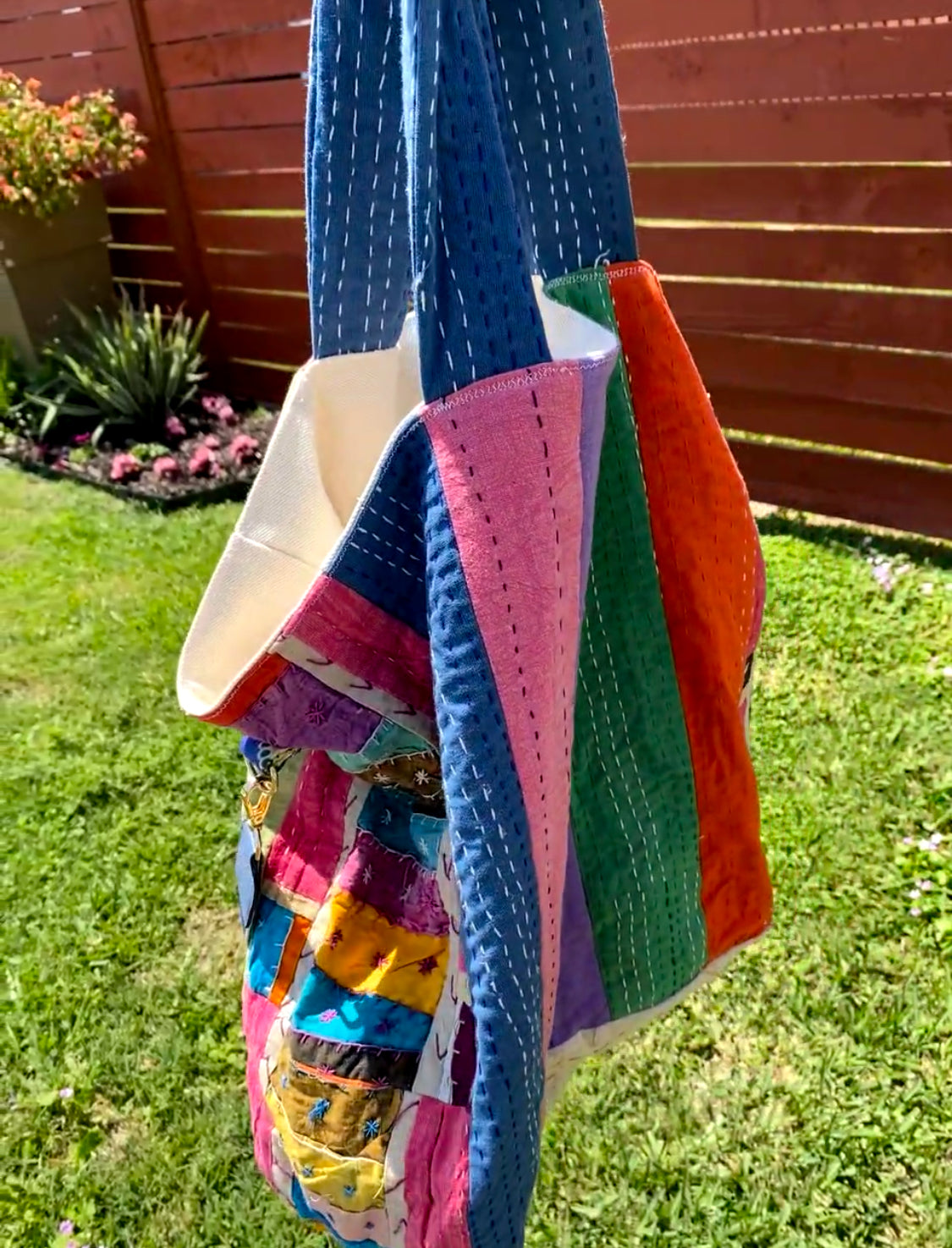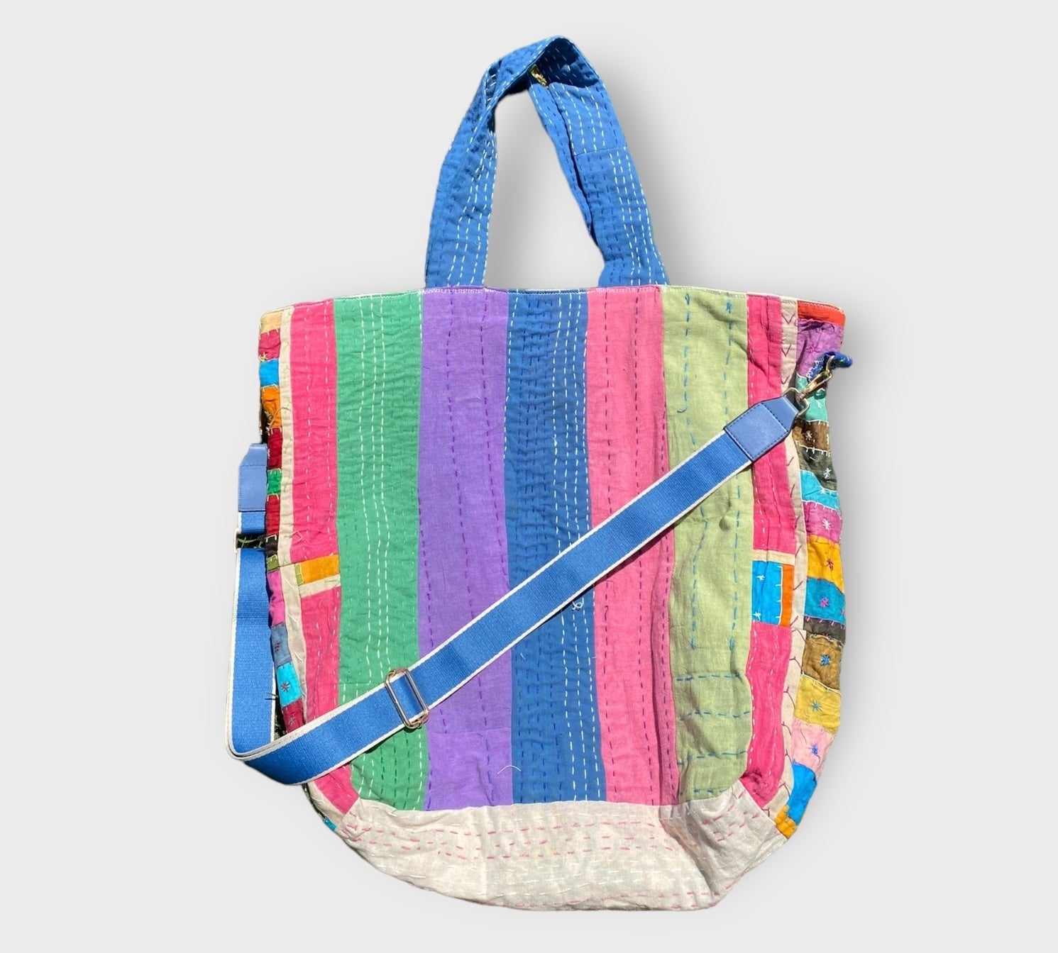 Carefully collaged kantha quilt tote with canvas lining and inner pocket. Two top handles and adjustable crossbody strap.