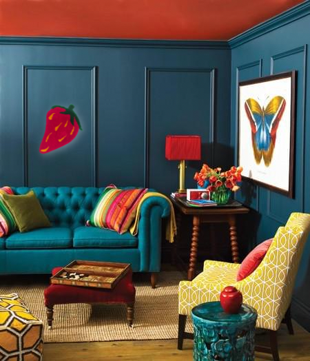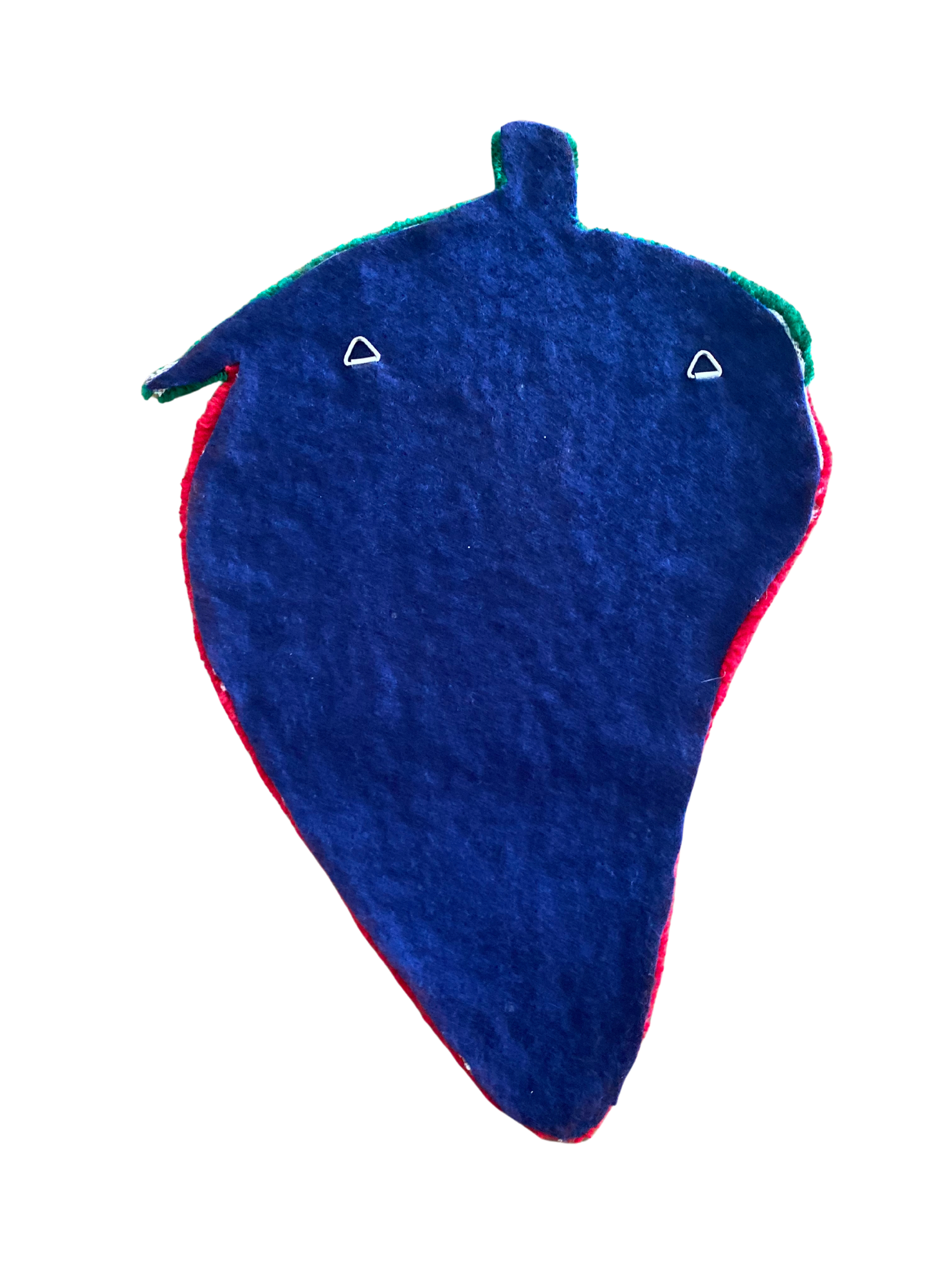Tufted wall piece with navy blue, felt backing and two hooks for hanging. Made with acrylic yarn. Spot clean only.