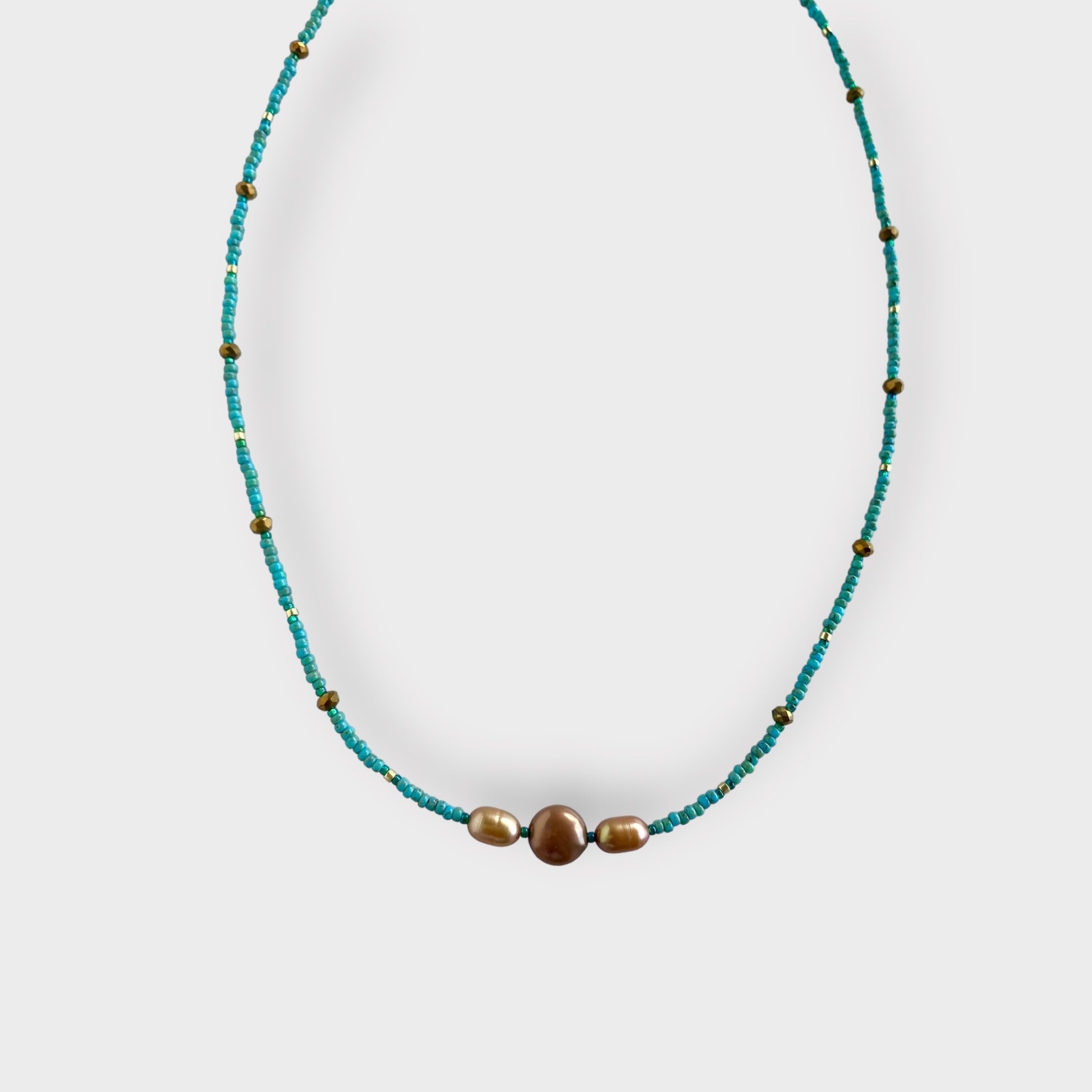 -Three bronze freshwater pearls as pendant, surrounded by teal glass Picasso beads
